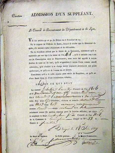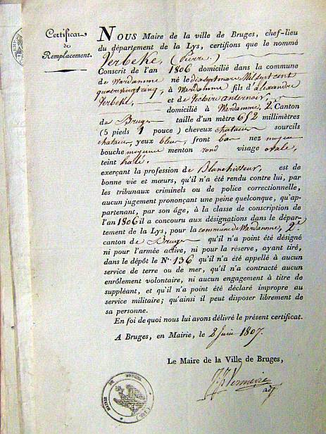 ú French 1.jpg - Certificate of replacement. The certificate says that Pierre Verbeke had good luck at the lottery of 1806 : his number was the number 136. So he didn't have to fulfill his military service. He was a man of good conduct : he hadn't had trouble with the justice department. The certificate shows also that he wasn't a volunteer in the army and that he was of good health. There is also mentioned other information on Pierre Verbeke. Length : 1,652 m. Hair color : brown.