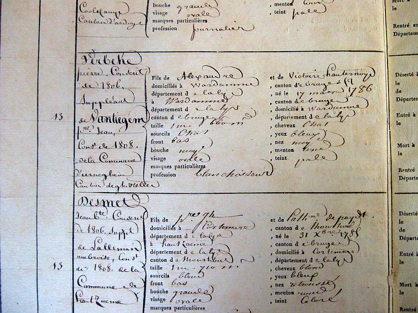 ú French 2.jpg - This is a copy of a register of 1808 of replacements after the lottery. It mentions that Pierre Verbeke of the lottery of 1806 replaces Pierre Vantieghem, living at Eernegem, of the lottery of 1808. The other information is about Pierre Verbeke. Length : 1,660 m. Hair color : brown. Mouth : medium. Eyes : blue. Nose : medium.