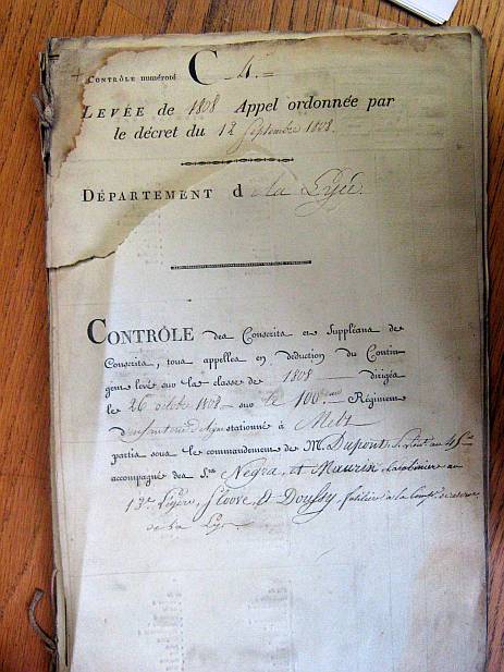 ú French 3.jpg - First page of a register of soldiers (coming directly from the lottery as well as from the replacements) of the 100th Infantry Regiment camped at Metz (in France). Their commander in chief was lieutenant Dupont. I also see a reference to the "45", maybe it's a reference to the 45th Grand Army of Napoleon ? Of this 45th Grand Army, I am sure that it was in May 1809 in Spain as a family member Verplancke died there. Is it possible that seven months before 26/10/1808) it stayed in Metz ?